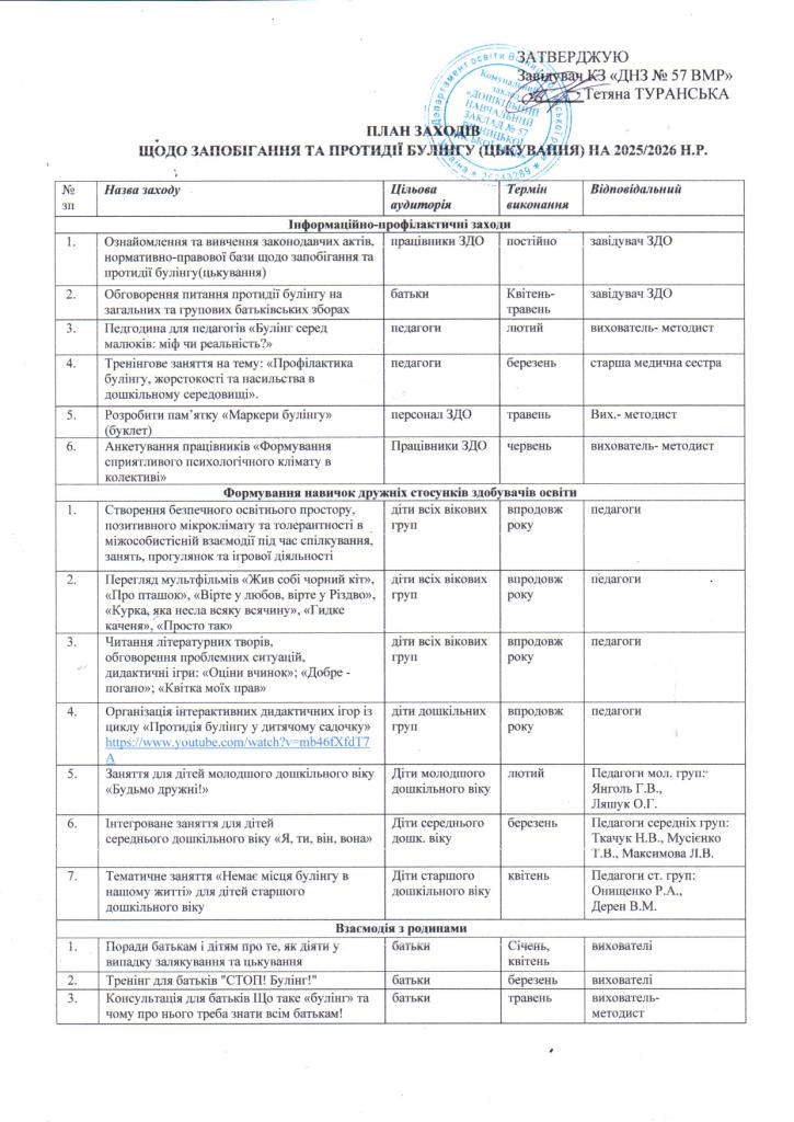 ПЛАН ЗАХОДІВ ЩОДО ЗАПОБІГАННЯ ТА ПРОТИДІЇ БУЛІНГУ (ЦЬКУВАННЯ) В КЗ «ДНЗ No 57 ВМР» НА 2025/2026 Н.Р.
